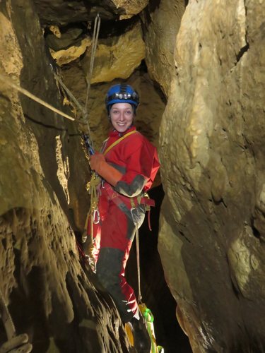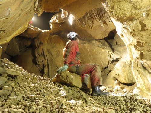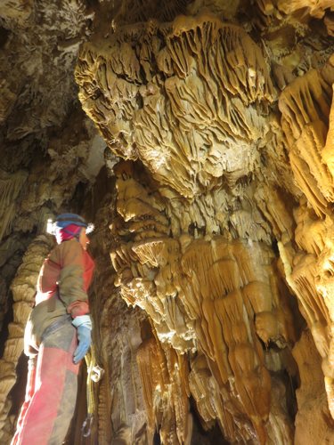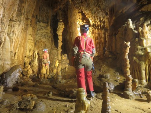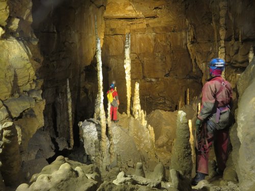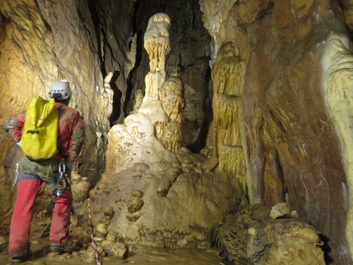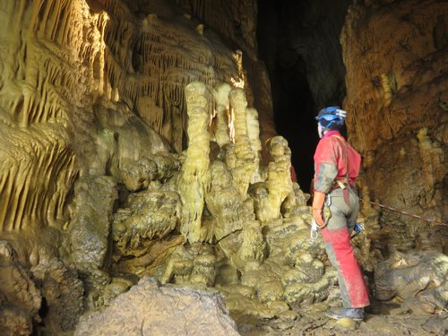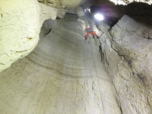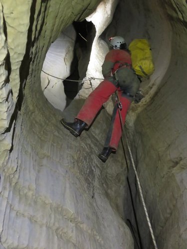 Zunächst sind 2 Seile mit einigen Umhängestellen einzubauen, dann ein kurzer, steil abfallender Gang der in einen kleinen abschüssigen Raum führt. Um von hier in die schönsten Höhlenteile zu gelangen ist ein kleiner Kletteraufstieg und ein anschließender Schlufgang zu bewältigen. Dieser mündet auf einer Plattform ein, von der ein paar Meter in die grosse Halle abgeseilt werden muß. Ziel erreicht! Nach einer kleinen Pause noch einige Fotos gemacht, dann ging es wieder Richtung Ausgang.
