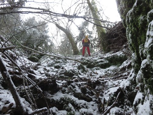 notgedrungen einen Schraubkarabiner. Tag 3, 04.01.2017: Die Mädels wollten heute ihren berühmten shopping – Tag machen, d.h. von Schaufenster zu Schaufenster bummeln, Klamotten anprobieren und evtl. kaufen und alle möglichen Leckereien mitbringen. Das war natürlich nichts für Klaus und mich. Wir entschieden uns für die Gouffre de la Belle Louise, deren letzte Befahrung auch mehr als 10 Jahre zurückliegt. Durch den Ausfall der Mädels konnten wir uns Tamis Rondo schnappen und verfügten damit über 2 voll funktionstüchtige Schachtausrüstungen. Schlotterkalt war’s beim Umziehen, denn ein eisiger Wind pfiff uns um die Nase. Schnell ging es daher zum Eingang in der Doline, wo es etwas windgeschützter war. Wir waren mit dem Einbauen des Einstiegs gerade fertig, da kamen 2 Höfos vom GCPM des Weges. Sie waren in einer Höhle „um die Ecke“ am Forschen, wo sie nun schon in ca. 100 m Tiefe wären und wir dürften uns diese Höhle gerne auch mal ansehen. Vermerkt! Doch heute ging es erstmal in die Belle Louise. Dank vieler neuer Haken ist der Einbau deutlich vorgeben. Der knapp 50 m tiefe Schacht wird dadurch in ca. 15 m tiefe Abseilstrecken zerlegt. Ein großer Vorteil beim Wiederaufstieg! Nach kurzer Schlufpassage folgen die nächsten Schächte, die alle mit neuen Haken ausgestattet sind.