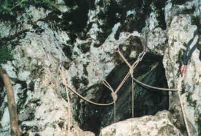 Von 4 Franzosen im Aven des Oubils am Eingangsschacht (von 3 Abseilstrecken ca. 10 Spits waren alle belegt!) - irgendwie mogelten wir uns trotzdem hinein ...