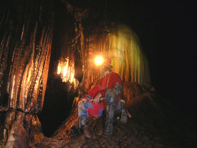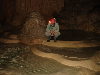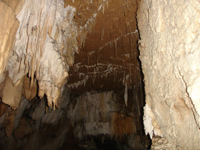 Mit Seilsicherung querten wir vorbei an tiefen Strudeltöpfen den Eingangsbereich der Höhle. Dann war wieder Laufen angesagt. Sehr großräumig ging es weiter. Deutlich konnte man die Spuren der Wassermassen erkennen die bei Regen regelmäßig durch den Gang brechen. Keine Höhle für Regentage! Im hinteren Teil der Höhle zeigte sich reichlich Sinterschmuck, zum Teil pechschwarz.