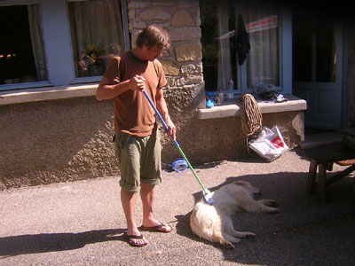 Bis dorthin hatten wir bereits unser gesamtes Material, an die 50 Karabiner und Laschen und teilweise sogar Karabiner der persönlichen Ausrüstung, aufgebraucht. Der Vorteil einer solchen Mäanderhöhle ist eine blitzblanke Ausrüstung. Ab -160m änderte sich leider der Charakter der Höhle und damit unser Aussehen: teilweise enge Mäanderpassagen, die immer schlammiger wurden führten uns noch bis auf -180m. Hier brachen wir an einem Schlamm-Wasser-Schluf ab und zogen uns Richtung Ausgang zurück. Nach all der Mühe wurde den ausgehungerten Höfos ein ordentliches Speleo - Menü aufgetischt. Ein Leben wie Gott in Frankreich...! Dienstag - It's showtime Wie jeden Morgen, begann der Tag mit einem reichhaltigen Frühstück. Danach machten wir uns an ein dicht gedrängtes Programm.